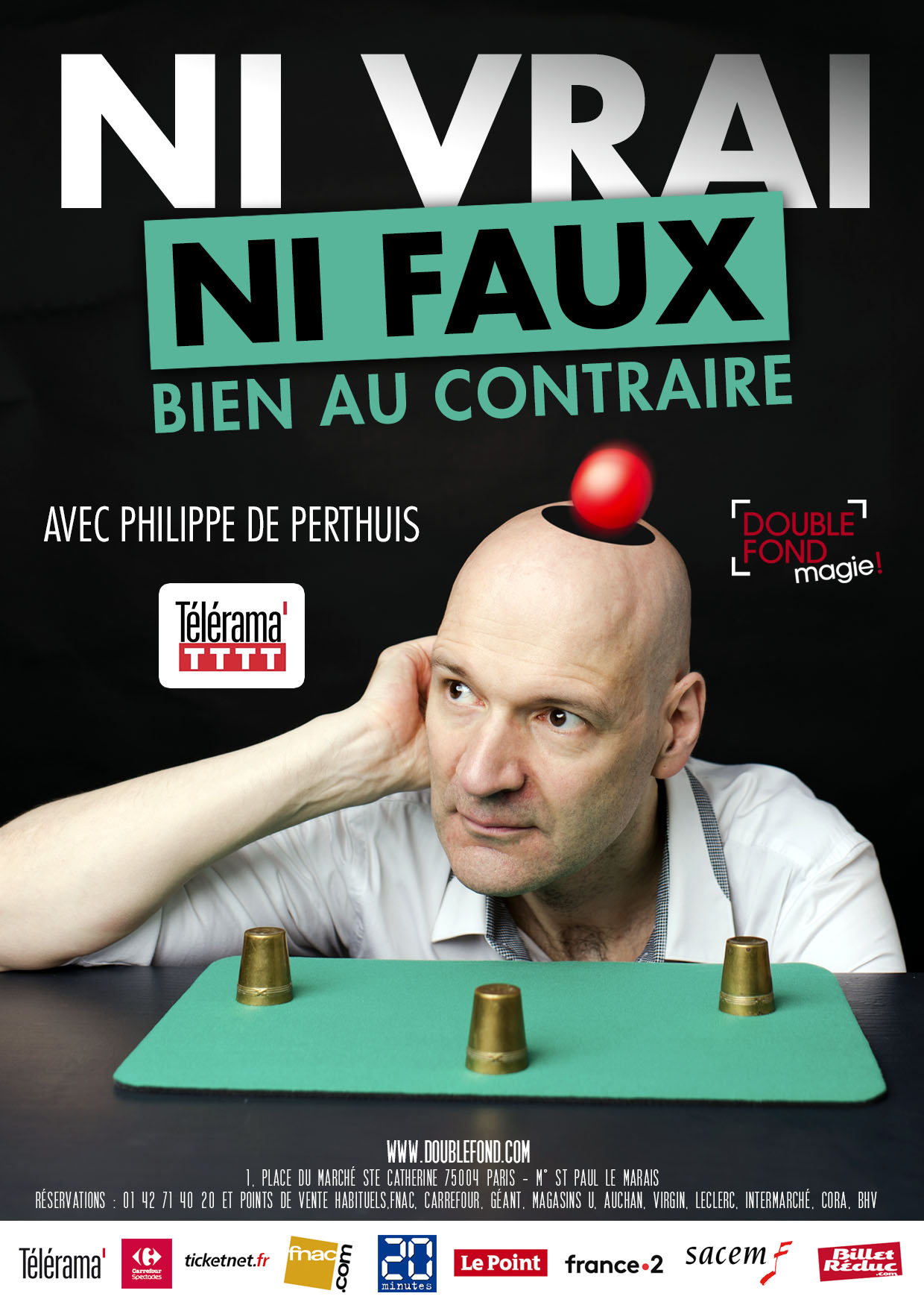 « Au Double Fond, chaque magicien concocte un spectacle dont la réussite repose aussi sur sa personnalité. Philippe de Perthuis, ingénieur reconverti, manie les cartes avec un humour pince-sans-rire et une intelligence imaginative : il pose quelques questions sibyllines, il s’attarde sur quelques invraisemblables histoires, le tout pour mieux s’emparer du cerveau d’un public qu’il laisse pantois. Oui, il devinera le plat auquel vous pensez, oui, il saura retrouver votre boucle d’oreille dans une boîte bien fermée… Un spectacle bluffant, pour adultes et adolescents, en toute intimité »